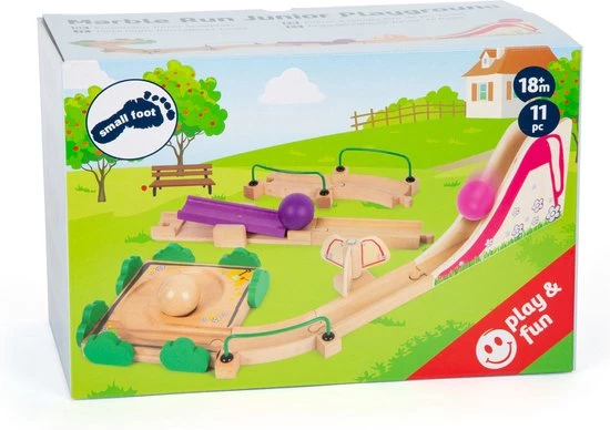 Heel veel knikkerplezier voor de allerkleinste knikkerbaanfans! De onderdelen van deze Junior Marble Run zijn heel eenvoudig in elkaar te zetten, zodat de extra grote, kleurrijke houten ballen aan hun tocht naar beneden kunnen beginnen. En passend bij het speeltuinthema sieren de glijbaan, draaimolen, wip en zandbak dit spel als vertrouwde motieven en bieden afwisseling voor de hindernisbaan. Het is uitbreidbaar en combineerbaar knikkerplezier met een leer- en “Wow”-effect!