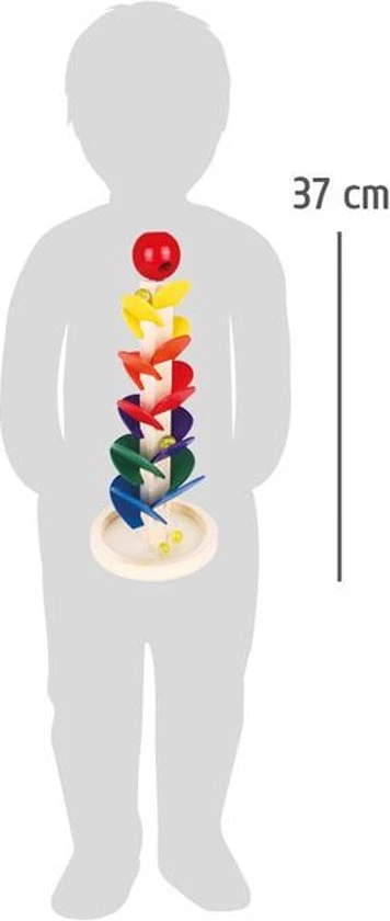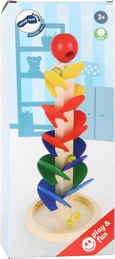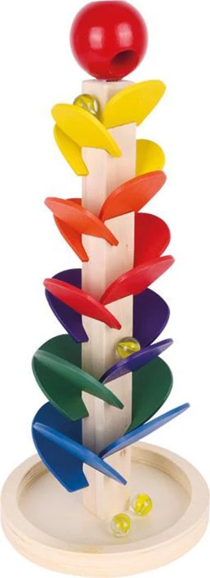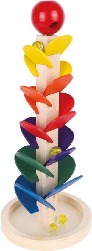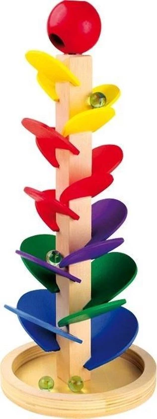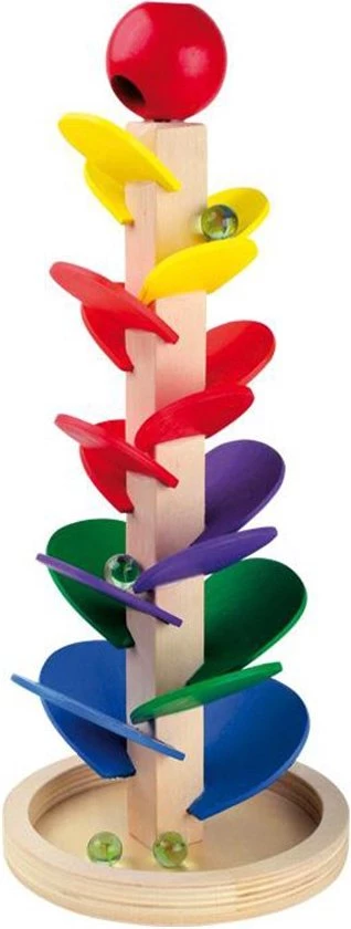 Deze knikkerbaan is een echt klankbelevenis! Zodra de glazen knikker in de rode houtkogel gelegd wordt, valt hij op de houten vleugels van verschillende maten en zo ontstaan ook verschillende geluiden. Van boven naar beneden worden de klanken steeds donkerder.