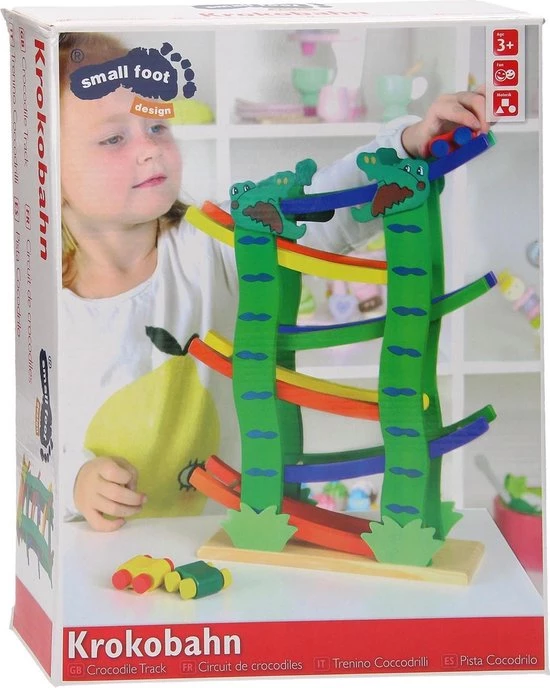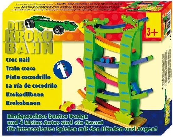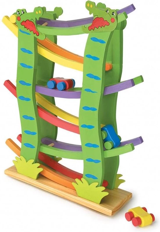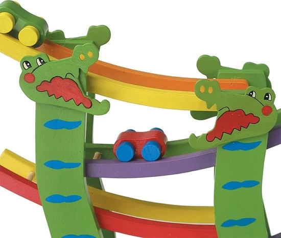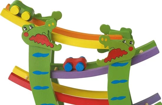 Leuke houten autobaan in de vorm een krokodil! Laat de auto’s van boven naar beneden de autobaan afleggen en begin vervolgens weer opnieuw. Bij de autobaan zitten 4 gekleurde auto’s inbegrepen.