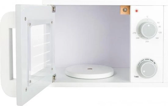 Ding … het eten is klaar! Met deze houten speelmagnetron kunnen kinderen doen alsof ze eten opwarmen en eten bereiden. Deze realistische speelmagnetron biedt een draaiplaat en een deur die door een magneet wordt gesloten. De temperatuur- en tijdfuncties kunnen eenvoudig worden ingesteld met de draaibare knoppen die klik geluiden maken. Een praktisch huishoudapparaat dat thuis hoort in elke moderne speelkeuken voor kinderen. Een ideale aanvulling op alle speelkeukens voor kinderen.