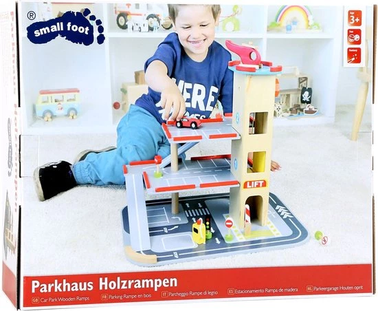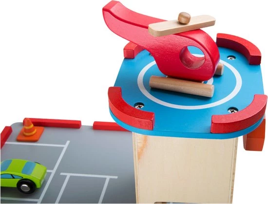 Enorm veel plezier op drie verdiepingen. Er is veel gaande in deze houten parkeergarage met meerdere verdiepingen. Een traploze lift met een slingeraandrijving brengt de auto’s omhoog zodat ze over de opritten kunnen rennen. De helikopterplatform biedt ruimte voor een helikopter die klaar is voor elke missie. Er is een brandstofpomp beschikbaar voor de benodigde rit. Verkeerslichten en verkeersborden krijgen de dingen in de rij.