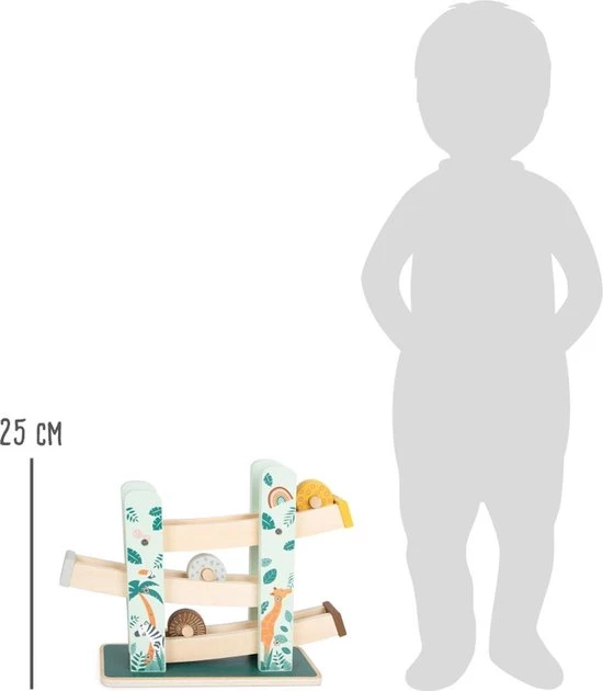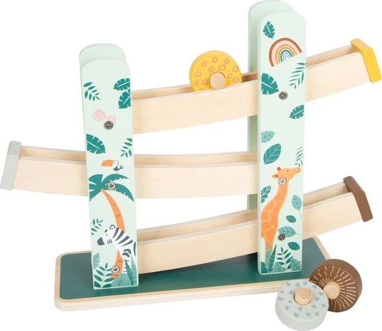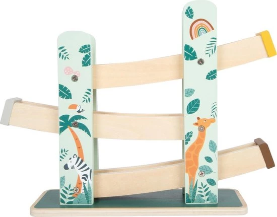 Cruise door de wildernis met de drie bijgeleverde houten ballen! Je kunt eventueel je eigen knikkers er aan toevoegen voor een extra belevenis. De knikkerbaan heeft drie afdalingen met trendy bladmotieven en safaridieren.