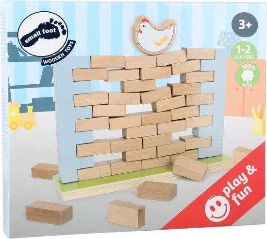 Hoe veel stenen laten zich uit de wiebelmuur trekken totdat die in elkaar zakt? Kinderen kunnen met dit mooie houtspel veel over statistiek, evenwicht en constructie leren.