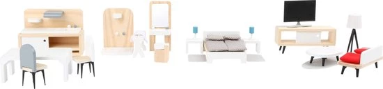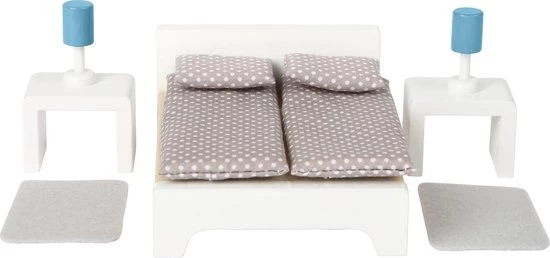 Deze mooie houten slaapkamermeubels maken jouw poppenhuis helemaal compleet. Vanaf nu kunnen jouw poppen en knuffels heerlijk spelen, zich wassen en tot rust komen.