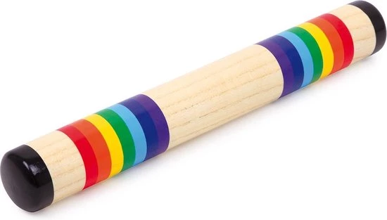 Een speelgoed voor zachte regengeluiden of een super ritme-instrument is deze houten buis met vrolijk kleurige sierstrepen.