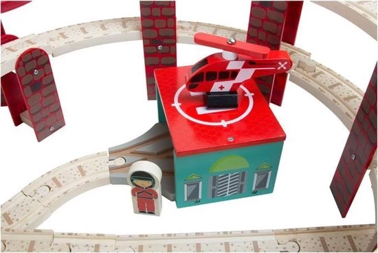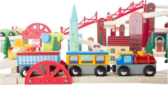 Enorm veel plezier met deze spoorwegset. De set bevat diverse voertuigen, figuren en een royale hoeveelheid accessoires. De vele verdiepingen en luchtspoorwegen geven kinderen veel vrije ruimte. Bijgeleverd zijn houten sporen met magneten, maar aan deze rails passen ook nog andere houten sporen. Door het in veel kleuren beschilderde hout maakt de spoorwegset een vrolijke indruk.
