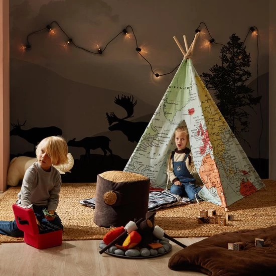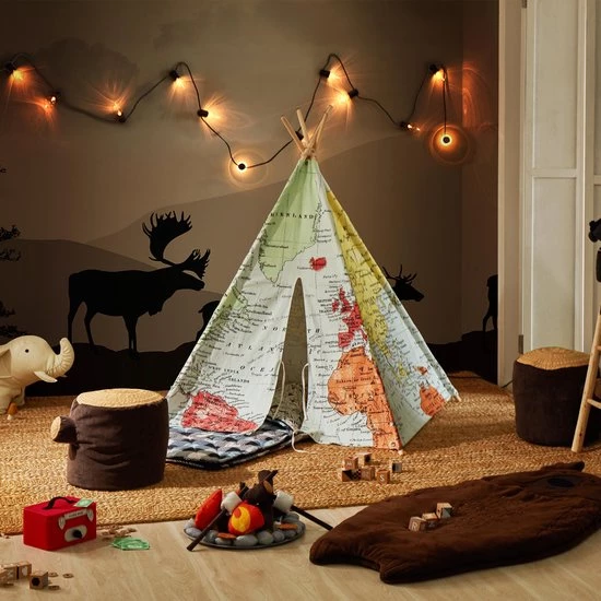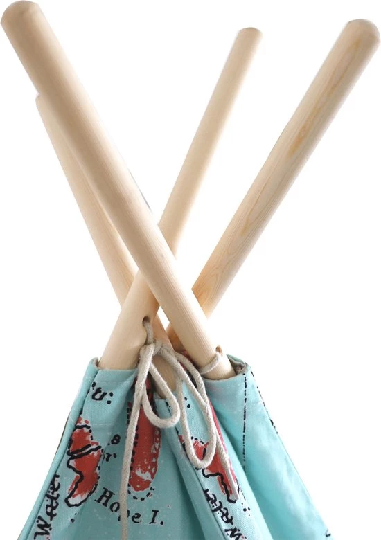 De Wereldkaart Tipi Tent is gemaakt van het beste materiaal. Zo hoeven jij en je kinderen zich alleen nog maar bezig te houden met spelen en avonturen beleven. De Tent bestaat uit een 100% natuurlijk, extra veilig, ademend katoenen canvas met een stevige constructie. De Tipi is eenvoudig te monteren door de 2-delige FSC 100% houten palen (? 2,4 cm) aan elkaar te maken doormiddel van een kunststof tussenstuk. Plaats de palen in de openingen van de katoenen canvas en bind de palen aan de bovenkant bij elkaar met het meegeleverde koord.