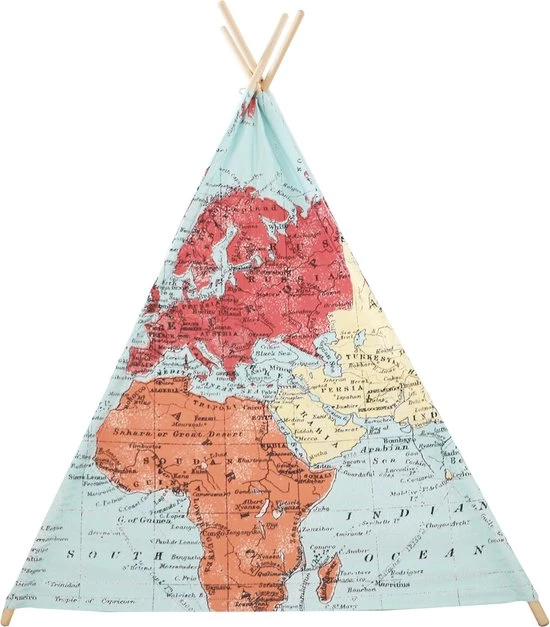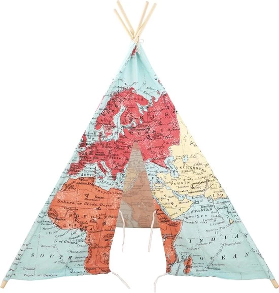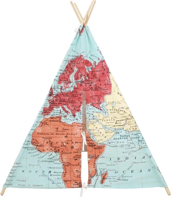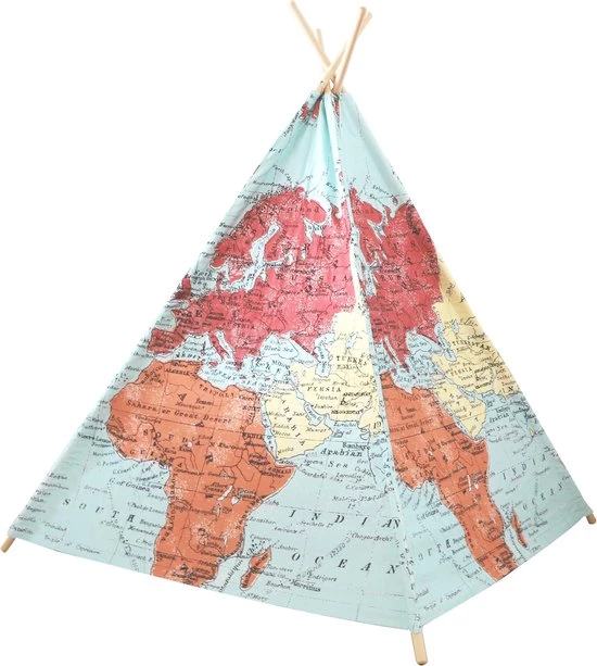 Met deze originele Wereldkaart Tipi Tent van Sunny, zullen kinderen een avontuur beleven. Waar ben je allemaal geweest? Ontdek de wereld en vertel verhalen die ze in hun dagelijks leven mee kunnen nemen. De kleuren en print zijn ideaal voor alle soorten kamers of voor het buiten spelen. Is dat niet perfect voor je kinderen? Als jullie zijn uitgespeeld vouw je de palen gemakkelijk bij elkaar, zodat je de Tipi kan meenemen of opbergen.