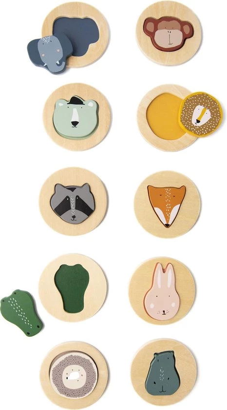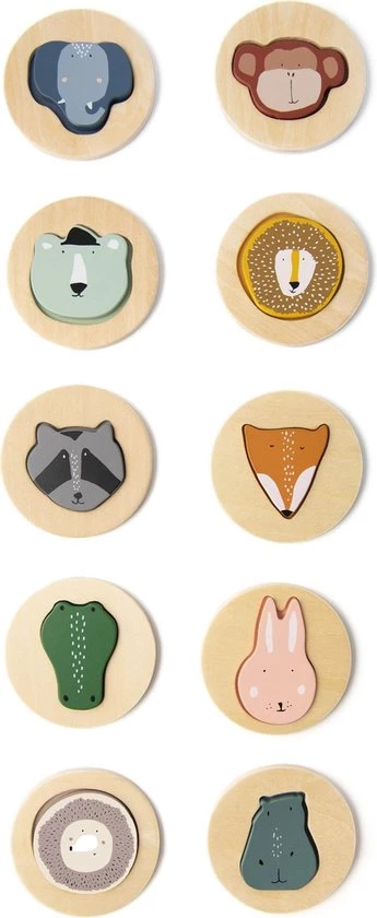 Dit spel kan je op veel leuke manieren spelen! Het is een leuke eerste puzzel, waarbij je probeert de dierenkop in de juiste cirkel te passen. Maar de pret begint pas echt als je samen speelt en probeert om zoveel mogelijk dieren met de juiste cirkel te matchen. Elke speler trekt een aantal dierenhoofden. De schijfjes worden met de bovenkant naar beneden op tafel gelegd. Elke beurt kan een speler een cirkel ronddraaien en controleren of deze overeenkomt met een van zijn of haar dieren. De eerste die alle dieren verzameld heeft, wint! Dit spel oefent zowel motorische als cognitieve vaardigheden. In het begin zullen kinderen het leuk vinden om over kleuren en dieren te leren. Eens wat ouder zullen ze de spanning van het spel ontdekken terwijl ze spelenderwijs hun geheugen trainen. Alle elementen zijn gemaakt van 100% FSC ? gecertificeerd hout. Alle verven zijn op waterbasis en veilig voor baby’s.